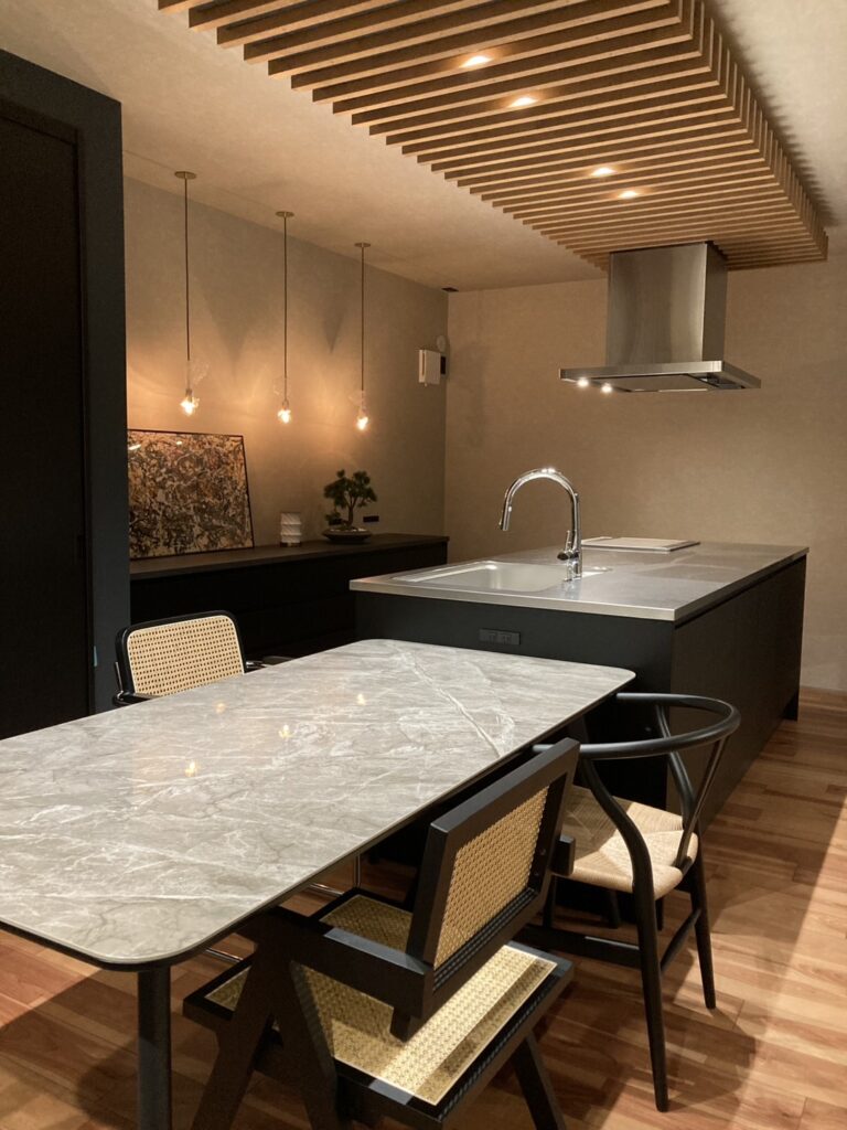 照明・ルーバー・アイランドキッチンが一体となり、機能性とデザイン性を兼ね備えた、心地よいキッチン空間に仕上がっています。