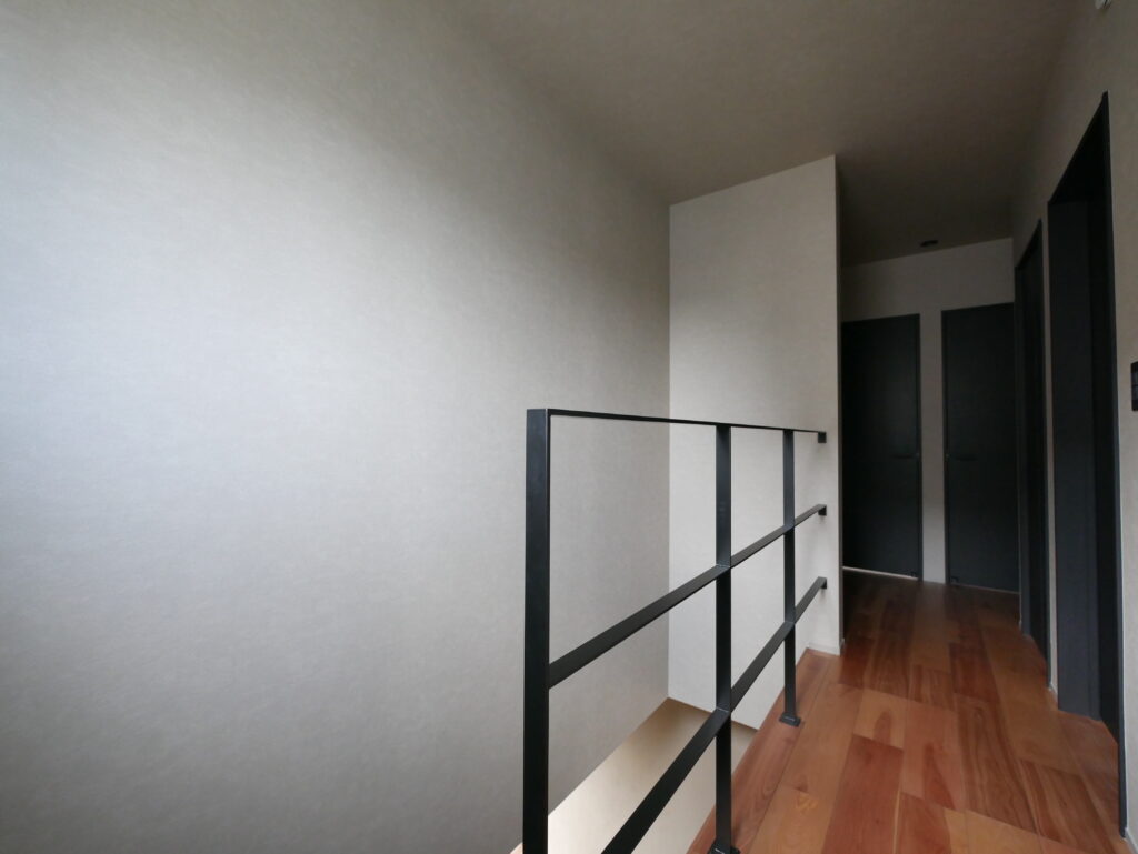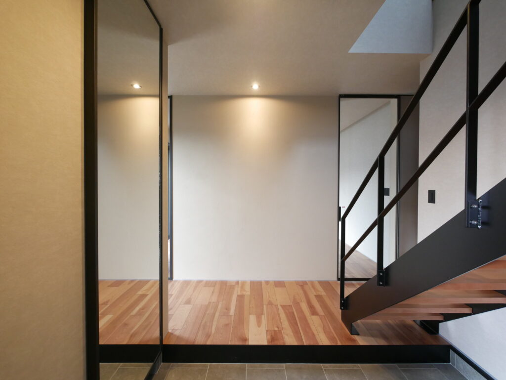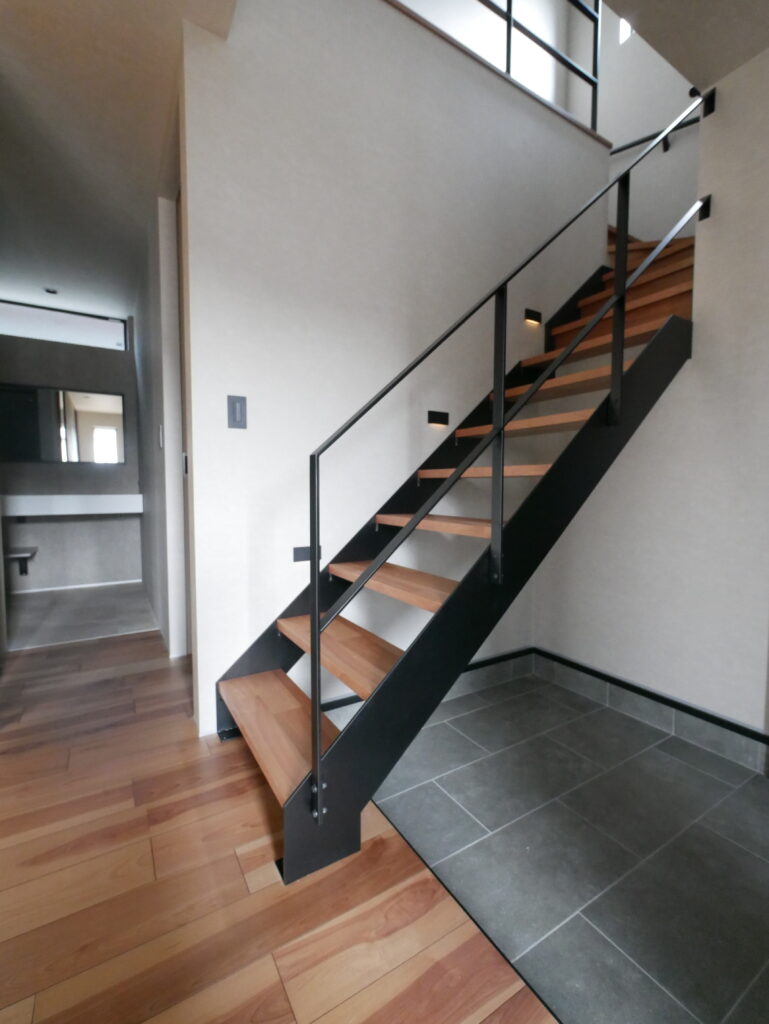 玄関扉を開けた瞬間、視線を惹きつける存在感のあるアイアン階段。