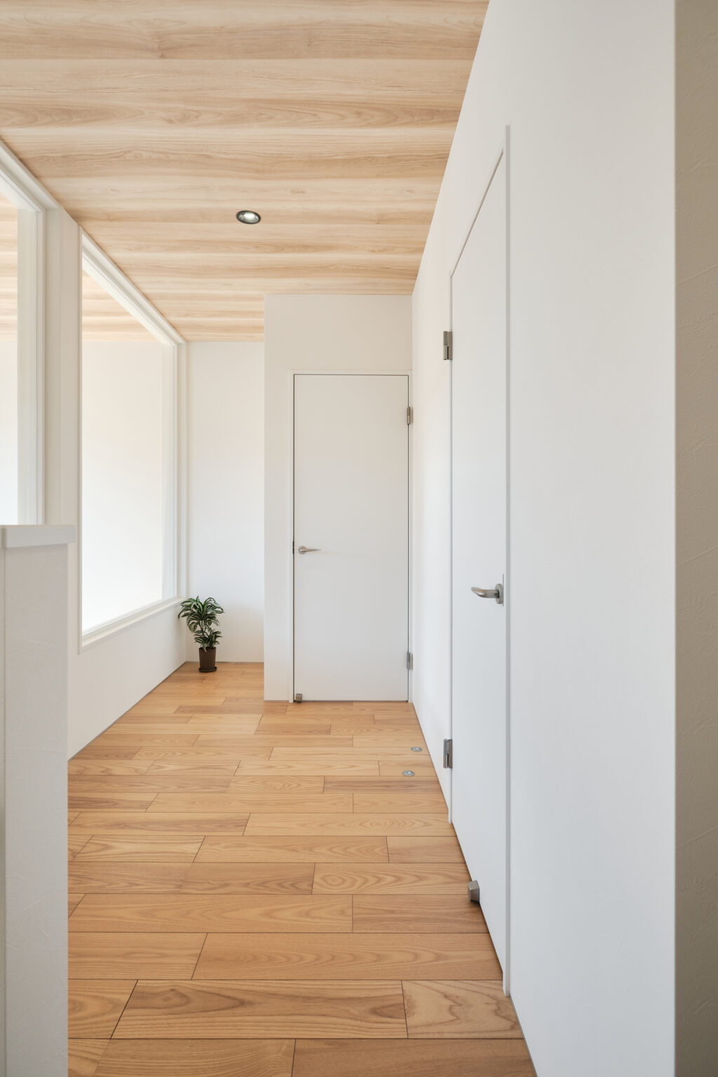 明るい玄関から洗面へとつながる回遊動線は生活の質を上げる。