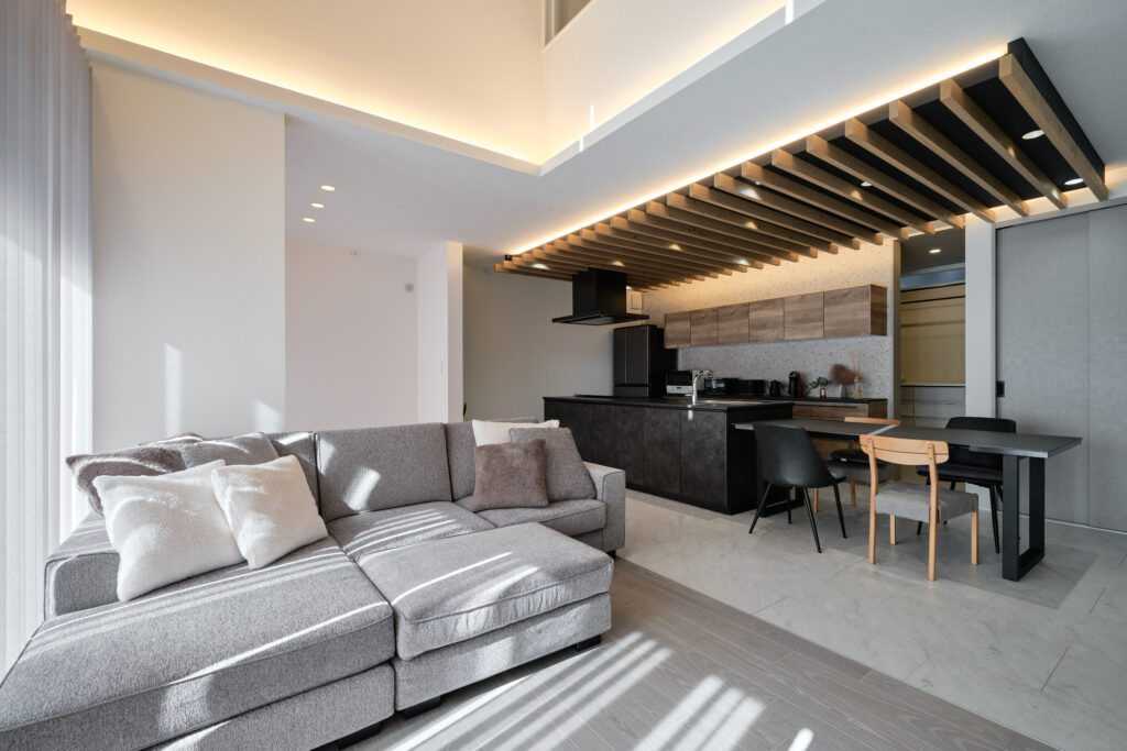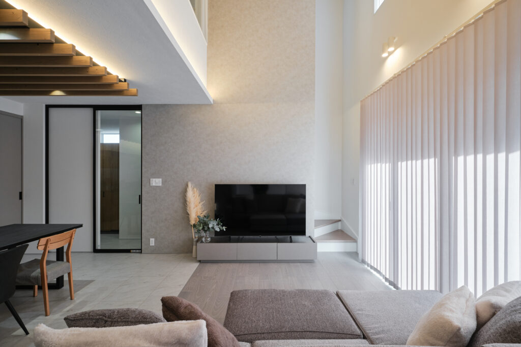 開放感のある吹き抜けのリビングは、大空間でも湿度ムラもなく快適に過ごせ、